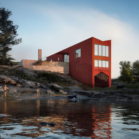 Ett långsmalt hus som följer berget ner mot strandkanten, utformat för att bli ett tydligt landmärke från vattnet.